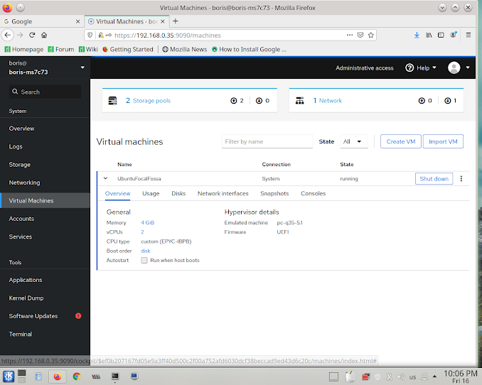 Attempt to test another Linux distro Manjaro KDE 20.1.1 as Virthost managed via Cockpit Web Console, i.e. deployment and management KVM guests on the recent Manjaro KDE utilizing Web Console . Bare metal platform is Ryzen 7 3700X based with 16 GB RAM and mother board MSI X570 A-PRO ( SVM status enabled )